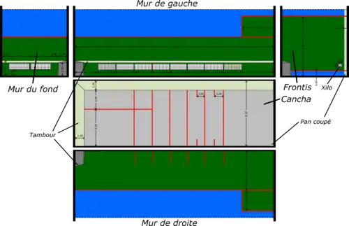 - fronton mur à gauche (appelé simplement frontón en espagnol et pilotaleku, « lieu de la pelote », en basque) ;