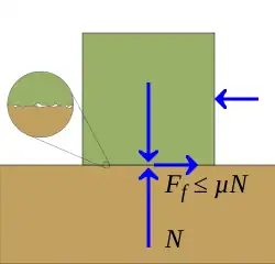 Lorsqu'une force est appliquée sur un objet reposant sur une surface (considérée comme immobile), la composante parallèle à la surface de cette force est compensée par une force de frottement statique opposée, qui maintient l'objet immobile pour autant que la composante parallèle de la force appliquée ne dépasse pas une valeur maximale[4]. L'observation expérimentale montre que, en première approximation, cette valeur maximale ne dépend que du poids apparent du corps et d'un coefficient de frottement statique, mais pas de l'aire de contact. Le coefficient de frottement statique, lui, dépend de la nature des surfaces en contact. Il détermine l'adhérence entre les deux corps.