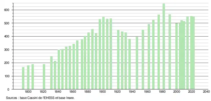 L'évolution du nombre d'habitants est connue à travers les recensements de la population effectués dans la commune depuis 1793. Pour les communes de moins de 10 000 habitants, une enquête de recensement portant sur toute la population est réalisée tous les cinq ans, les populations de référence des années intermédiaires étant quant à elles estimées par interpolation ou extrapolation[23]. Pour la commune, le premier recensement exhaustif entrant dans le cadre du nouveau dispositif a été réalisé en 2004[24].