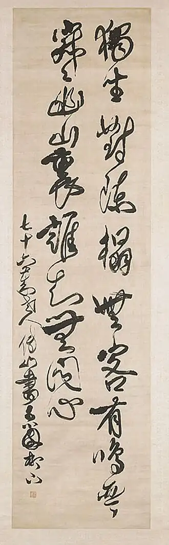 Ses œuvres calligraphiques, tout spécialement celles réalisées en cursive, sont indisciplinées et émouvantes, et reflètent les émotions violentes de son cœur. Avec conviction, il proclame:«Je préfère que mes calligraphies soient maladroites plutôt que raffinées. Je préfère la difformité à la fourberie, le spontané au prémédité[n 1]»[4].