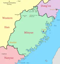 La région ne put être intégrée immédiatement au territoire chinois, car durant la période des Royaumes combattants, un royaume rival avait émergé dans l'actuel Fujian. Fondé par le peuple Yue au IIIe siècle av. J.-C., ce royaume, connu sous le nom de Minyue, s'était constitué après la conquête de leur territoire par le royaume de Chu. Sous la dynastie Qin, le Minyue fut formellement annexé au territoire Qin. Cependant, à l'effondrement de la dynastie Qin et pendant la guerre civile qui suivit, le roi Wuzhu de Minyue soutint Liu Bang, un seigneur de guerre qui luttait contre Xiang Yu. Grâce à l'aide de Wuzhu, Liu Bang fonda plus tard la dynastie Han. En 202 av. J.-C., le Minyue retrouva un statut de royaume semi-indépendant, sous la suzeraineté des Han. Ce royaume fut autorisé à construire des forteresses, notamment à Fuzhou et dans les monts Wuyi, et à étendre son territoire au-delà de l'actuel Fujian, englobant également l'est du Guangdong, le sud du Zhejiang et l'est du Jiangxi. Le Minyue, culturellement sinisé, alliait des éléments austronésiens à la culture han.