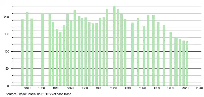 L'évolution du nombre d'habitants est connue à travers les recensements de la population effectués dans la commune depuis 1793. Pour les communes de moins de 10 000 habitants, une enquête de recensement portant sur toute la population est réalisée tous les cinq ans, les populations de référence des années intermédiaires étant quant à elles estimées par interpolation ou extrapolation[14]. Pour la commune, le premier recensement exhaustif entrant dans le cadre du nouveau dispositif a été réalisé en 2007[15].