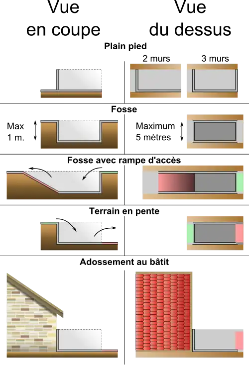 - en fosse dont l'un des côtés, en pente, constitue une rampe d'accès pour le véhicule d'enlèvement ; dans ce cas, elle est aussi appelée fosse à fumier[N 1] ou encore fosse à purin[2] ;