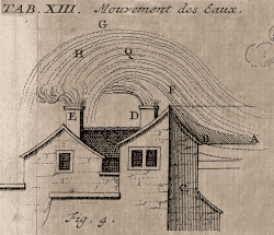 Cependant, lorsque existent d'autres constructions plus hautes (ou éventuellement un rideau d'arbre), le tirage de la cheminée peut ne plus exister pour certaines orientations de vent (image de gauche, datant de 1717, et image de droite). Il faut donc élever notablement la sortie des fumées.