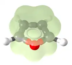 Densité électronique dans la molécule de furane illustrant l'effet donneur de l'oxygène. |