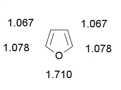 L'atome d'oxygène a un effet mésomère donneur et un effet inductif attracteur dans le furane. La délocalisation du doublet non liant constitue l'effet mésomère de l'oxygène tandis que l'attraction des électrons des liaisons C-O vers l'atome d'oxygène correspond à l'effet inductif. Le caractère inductif attracteur influence la répartition des électrons dans le cycle mais ne parvient pas à contrebalancer l'effet mésomère. L’oxygène apporte donc globalement une densité électronique supplémentaire dans le cycle. Cette contribution électronique de l'oxygène se traduit par des valeurs de densité électronique supérieures à 1 pour les carbones du cycle. L'effet mésomère donneur engendre une charge positive sur l'oxygène dans les quatre formes mésomères du furane et une charge négative délocalisée sur les carbones du cycle.