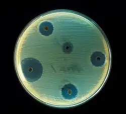 Test de la sensibilité de Staphylococcus aureus aux antibiotiques par antibiogramme. Les antibiotiques diffusent à partir de comprimés contenant des antibiotiques et inhibent la croissance de S. aureus, ce qui entraîne une zone d'inhibition.