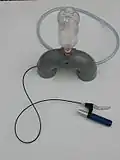 La partie mâle est adaptée au goulot de la bouteille de manière étanche et devient la tuyère. Le plus facile, pour ce faire, est de percer le bouchon de la bouteille pour y insérer le raccord mâle réduit par limage[n 6]. Un tuyau de cinq mètres est fixé au raccord femelle et fermé à son extrémité par une valve de vélo qui permet de brancher la pompe et de conserver la pression.