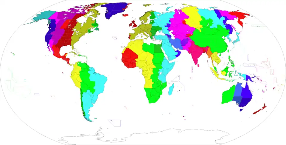 - Certains pays de taille étendue (Australie, Brésil, Canada, RD Congo, États-Unis, Indonésie, Russie, etc.) sont divisés arbitrairement en plusieurs fuseaux horaires de tailles variables : leurs limites peuvent ainsi se trouver franchement décalées par rapport à celles qui rapprocheraient l'heure légale de l'heure solaire. C'est également le cas de certaines dépendances éloignées, comme les DROM-COM français, les Açores portugaises, etc.