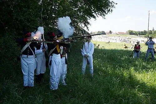 - ↑ « Comme on donne feu au mousquet avec la mèche, il faut qu'elle ait un charbon formé lequel charbon s'use dès le premier coup, et encore plus au 3e ce qui fait manquer si on ne précautionne par allumer l'autre bout avant que d'entrer en action, encore ne peut-il servir que pour tirer quatre ou cinq coups de suite après quoi les deux bouts sont usés et sujets à manquer. Au fusil il n'y a qu'à essuyer la pierre et au surplus la battre tant soit peu avec le dos d'un couteau et en tous cas en changer après avoir tiré 24 ou 30 coups de même. » (Vauban, dans « Moyens d'améliorer nos troupes »).