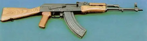 De son côté, l'URSS suit l'exemple, Mikhaïl Kalachnikov combinent les avantages révolutionnaire d'un chargeur amovible et des cartouches intermédiaire du StG 44 (concept révolutionnaire pour l'époque, les allemands se sont rendu compte que la plupart des engagements étaient en moyenne de 300m) et le système de récupération de gaz par piston et culasse calée du M1 Garand pour chambré les cartouches et développant ainsi, en 1947, l'AK-47 célèbre sous le nom de Kalachnikov et qui connaît une grande diffusion[1]. L'arme est chambrée pour le 7,62×39 mm, une munition d'un calibre équivalent au 7,62 OTAN ou au 7,62 du Mosin-Nagant alors en usage dans l'armée rouge mais moins puissante (E0 d'environ 2 000 joules) permettant un tir automatique plus maîtrisé et des chargeurs de 30 cartouches moins lourds et encombrants puisque la cartouche est plus légère, et 25 % plus courte. Sa simplicité et sa robustesse sont d'emblée très appréciées. Certains modèles de l'AK-47 sont produits avec une crosse métallique rétractable. Ce modèle propose ainsi une arme moins encombrante à transporter et plus compatible avec les espaces confinés (véhicules ou bâtiments). Elle est toutefois plus difficile à employer car, en présentant moins d'inertie, elle tressaute davantage lors du tir en mode automatique.