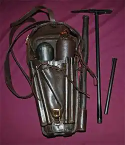 Une fois les réservoirs vides, la pompe (visible à droite sur la photo du sac d'accessoires) servait, une fois enfilée dans le fût de l'arme, à pressuriser le réservoir en agissant dessus comme avec une pompe de vélo (qui n'existait pas à l'époque). Une pression utile de 50 bars nécessitait environ 1 500 coups de pompe, ce qui était très handicapant pour le tireur.