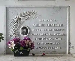 Tombe d'André Kraemer dans le mausolée du Souvenir Français au cimetière de Beausoleil (Alpes-Maritimes) André Kraemer : né le à Monaco et originaire de Beausoleil (Alpes-Maritimes). Fils de parents alsaciens originaires de Cernay. À 14 ans, il écrit sur les murs de Beausoleil: « À bas Pétain, vive de Gaulle, à bas Vichy ». Apprenti tapissier dans l'atelier de son père. Membre du mouvement Combat à Beausoleil. Lors du départ des Italiens, son groupe descend 20 grenades, 3 fusils et 300 cartouches d'un campement italien au-dessus de Peille (Alpes-Maritimes). André Kraemer fabrique des bombes pour les sabotages et attentats menés par son groupe. Il prend des clichés des installations ennemies, des campements de la région et du fort du Mont Agel. Il est dénoncé par un fasciste et arrêté par la Gestapo le en fin d'après-midi dans l'atelier en compagnie de son père. Les Allemands perquisitionnent et découvrent des munitions et des armes camouflées. Les Allemands lui demandent à quoi servent ces armes. Il répond: «C'est pour faire la guerre aux Allemands qui sont mes ennemis et ceux de mon pays tout entier.» Il est interrogé mais ne dénonce pas ses camarades. Il est enfermé aux Nouvelles-Prisons. André Kraemer est présent sur le Monument Aux Morts de Beausoleil. Il existe un square André Kraemer avec une plaque commémorative à Beausoleil.