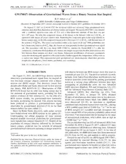 - [Abbott et al. 2017] (en) B. P. Abbott et al., « GW170817: Observation of Gravitational Waves from a Binary Neutron Star Inspiral », Physical Review Letters, vol. 119, no 16, (ISSN 0031-9007 et 1079-7114, DOI 10.1103/physrevlett.119.161101, lire en ligne).