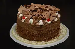 Le gâteau au chocolat est fait à base de chocolat. Il peut également contenir d'autres ingrédients[1], notamment du fondant, de la crème à la vanille et d'autres édulcorants. L'histoire du gâteau au chocolat remonte au XVIIe siècle, lorsque de la poudre de cacao provenant des Amériques a été ajoutée aux recettes traditionnelles de gâteaux[2]. En 1828, le Néerlandais Coenraad van Houten a mis au point une méthode d'extraction mécanique pour séparer la graisse de la liqueur de cacao, ce qui a donné le beurre de cacao et le cacao partiellement dégraissé, une masse compacte de solides qui pouvait être vendue sous forme de « cacao de roche » ou broyée en poudre[3]. Ces procédés ont transformé le chocolat, qui était un luxe exclusif, en un en-cas quotidien peu coûteux[3].