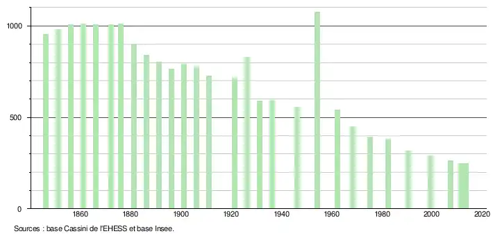 L'évolution du nombre d'habitants est connue à travers les recensements de la population effectués dans la commune depuis 1846. À partir du , les populations légales des communes sont publiées annuellement dans le cadre d'un recensement qui repose désormais sur une collecte d'information annuelle, concernant successivement tous les territoires communaux au cours d'une période de cinq ans. Pour les communes de moins de 10 000 habitants, une enquête de recensement portant sur toute la population est réalisée tous les cinq ans, les populations légales des années intermédiaires étant quant à elles estimées par interpolation ou extrapolation[8]. Pour la commune, le premier recensement exhaustif entrant dans le cadre du nouveau dispositif a été réalisé en 2007[9],[Note 1].