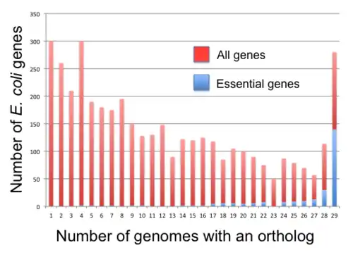 Chez les bactéries, il apparaît que les gènes essentiels sont plus conservés que les gènes non essentiels[66], bien que la corrélation ne soit pas très forte. Par exemple, seulement 34 % des gènes essentiels de B. subtilis possèdent des orthologues fiables chez tous les Firmicutes, et 61 % des gènes essentiels d'E. coli possèdent des orthologues fiables chez toutes les Gammaproteobacteria[67]. En 2005, Fang et ses collaborateurs définissent les gènes persistants comme les gènes présents dans plus de 85 % des génomes du clade[67]. Ils ont trouvé 475 et 611 de ces gènes chez B. subtilis et E. coli, respectivement. De plus, ils ont classifié les gènes en cinq classes selon leur persistance et leur essentialité : les gènes persistants, les gènes essentiels, les gènes non essentiels persistants (276 chez B. subtilis, 409 chez E. coli), les gènes essentiels non persistants (73 chez B. subtilis, 33 chez E. coli) et enfin les gènes non essentiels non persistants (3 558 chez B. subtilis, 3525 chez E. coli). Fang et ses collaborateurs ont trouvé 257 gènes persistants qui existent à la fois chez B. subtilis (pour les FIrmicutes) et chez E. coli (pour les Gammaproteobacteria). Parmi ces gènes, respectivement 144 et 139 ont été préalablement identifiés comme essentiels respectivement chez B. subtilis et E. coli, et respectivement 25 et 18 de ces 257 gènes ne sont pas présents respectivement chez les 475 et 611 gènes persistants de B. subtilis et d'E. coli. Tous les autres membres de ce groupe de gènes sont non essentiels persistants[67].