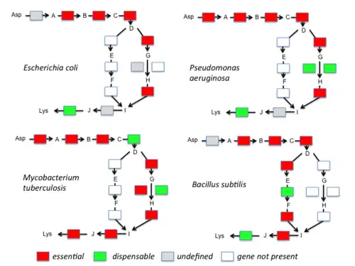 Les gènes impliqués dans certaines voies de biosynthèse, comme la synthèse des acides aminés, peuvent devenir non essentiels si un ou plusieurs acides aminés sont fournis par un autre organisme[63]. C'est la principale raison pour laquelle beaucoup bactéries parasites ou endosymbiotiques ont perdu beaucoup de gènes (par exemple chez les Chlamydia). De tels gènes peuvent être essentiels mais présents seulement dans l'organisme-hôte. Par exemple, Chlamydia trachomatis ne peut pas synthétiser les purines et les pyrimidines de novo (à partir de molécules simples comme des sucres et des acides aminés), et donc cette bactérie est dépendante des gènes codant la biosynthèse des nucléotides présents dans le génome de l'hôte[64].