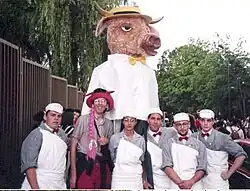 - ↑ Sur cette photo le Géant-Bœuf posé à terre repose sur ses pieds munis de rallonges. La participation des élèves de l'École Nationale Supérieure des Métiers de la Viande a été souhaitée par les organisateurs Alain Riou et Basile Pachkoff, en référence aux garçons-bouchers qui accompagnaient le Bœuf Gras en février 1739 à Paris. D'autres élèves de la même école le porteront lors du cortège de renaissance du Carnaval de Paris le 27 septembre 1998. L'École Nationale Supérieure des Métiers de la Viande qui forment de nouveaux bouchers se trouve 37 boulevard Soult à Paris dans le 12e arrondissement. Dans le milieu de la boucherie française elle est couramment appelée « l'école du boulevard Soult ».