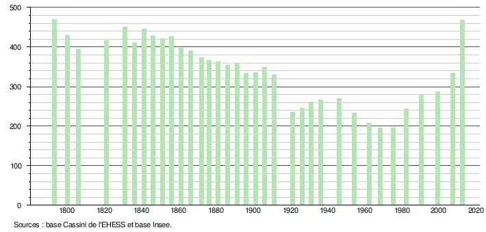 - ↑ Par convention dans Wikipédia, le principe a été retenu de n’afficher dans le tableau des recensements et le graphique, pour les populations légales postérieures à 1999, que les populations correspondant à une enquête exhaustive de recensement pour les communes de moins de 10 000 habitants, et que les populations des années 2006, 2011, 2016, etc. pour les communes de plus de 10 000 habitants, ainsi que la dernière population légale publiée par l’Insee pour l'ensemble des communes.