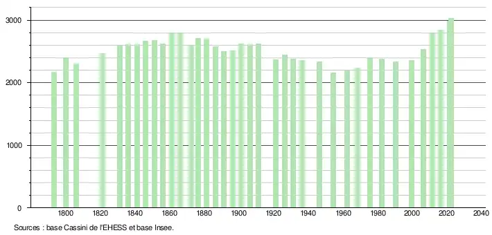 - ↑ Population municipale de référence en vigueur au 1er janvier 2025, millésimée 2022, définie dans les limites territoriales en vigueur au 1er janvier 2024, date de référence statistique : 1er janvier 2022.