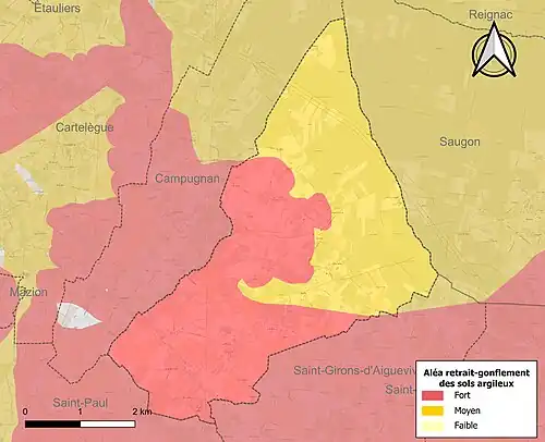 Le retrait-gonflement des sols argileux est susceptible d'engendrer des dommages importants aux bâtiments en cas d’alternance de périodes de sécheresse et de pluie. La totalité de la commune est en aléa moyen ou fort (67,4 % au niveau départemental et 48,5 % au niveau national). Sur les 274 bâtiments dénombrés sur la commune en 2019, 274 sont en aléa moyen ou fort, soit 100 %, à comparer aux 84 % au niveau départemental et 54 % au niveau national. Une cartographie de l'exposition du territoire national au retrait gonflement des sols argileux est disponible sur le site du BRGM[20],[Carte 2].
