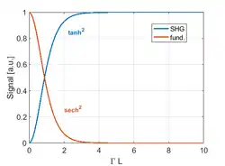 Dans le cas particulier de SHG (n = 2), dans un milieu de longueur L et une position focale à , l'intensité s'écrit[23] : .
