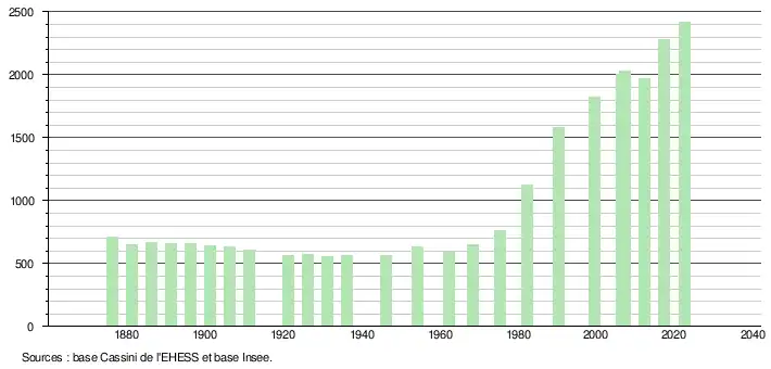 L'évolution du nombre d'habitants est connue à travers les recensements de la population effectués dans la commune depuis 1876. Pour les communes de moins de 10 000 habitants, une enquête de recensement portant sur toute la population est réalisée tous les cinq ans, les populations de référence des années intermédiaires étant quant à elles estimées par interpolation ou extrapolation[21]. Pour la commune, le premier recensement exhaustif entrant dans le cadre du nouveau dispositif a été réalisé en 2007[22].
