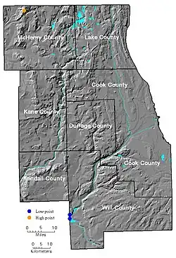 La ville a une altitude moyenne d'environ 176 mètres au-dessus du niveau moyen de la mer[1],[2]. Le point culminant naturel de Chicago se trouve dans le secteur de Beverly (224 m)[5] dans le sud-ouest de la ville et le point le plus élevé se trouve dans le secteur de Hegewisch à l'extrémité sud de la ville. La topographie plate de Chicago est rarement identifiée comme une caractéristique naturelle positive pour la ville. Contrairement à d'autres villes comme San Francisco ou Boston, Chicago n'est pas constituée de collines ou de montagnes pour aider à distinguer et créer son identité. Cependant, cette topographie plate expansive a permis à l'urbanisme et l'architecture de Chicago de définir l'identité de la ville. Les gratte-ciel du quartier d'affaires et les bâtiments résidentiels du littoral donnent du relief et du contraste à la grande planéité de cette région agricole et marque la confluence entre la rivière Chicago et le lac Michigan.