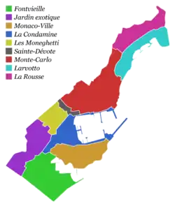 La principauté compte 5 469 m de frontière avec la France (dont : 3 274 m avec la commune de Beausoleil, 1 341 m avec Cap-d'Ail, 464 m avec Roquebrune-Cap-Martin et 390 m avec La Turbie), ainsi que 3 829 m de côte (port et plage). Au cours des dernières années, des grands travaux ont permis à Monaco de s’étendre de près de 40 hectares gagnés sur la mer par le biais de remblais.
