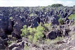 Les trente premiers mètres de cette couche ayant été ensuite exposés à l'air libre, la couche superficielle a subi une érosion de type karstique par dissolution et a formé les pinacles[8]. Dans le même temps, la couche située jusqu'à 55 mètres de profondeur sous la mer s'est creusée de grottes et de cavités. Il y a 15 000 ans, le niveau des océans était situé à 100 mètres sous le niveau actuel à cause de la glaciation. La partie émergée de Nauru était ainsi plus étendue[9].