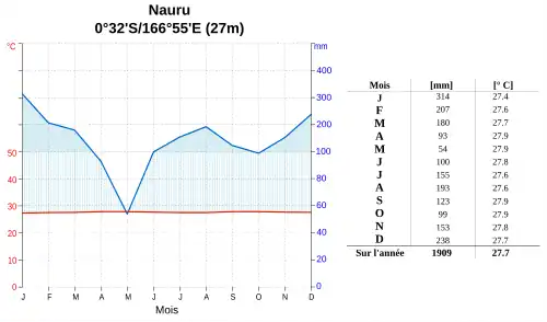 Le climat de Nauru est tropical avec une mousson de novembre à février[8] qui concentre l'essentiel des précipitations pouvant fluctuer de 280 millimètres à 4 590 millimètres par an (en moyenne 2 126 millimètres par an)[1],[3]. Entre 1977 et 1993, 64 mois sur 204 (mois où les données ont disponibles) ont connu des précipitations inférieures à 100 millimètres[1]. La pluviométrie se trouve affectée par l'exploitation du phosphate[11]. En effet, le remplacement de la forêt tropicale par un paysage dénudé et aride modifie les flux atmosphériques car l'air chaud s'élevant du plateau repousse les nuages et les précipitations diminuent[11].