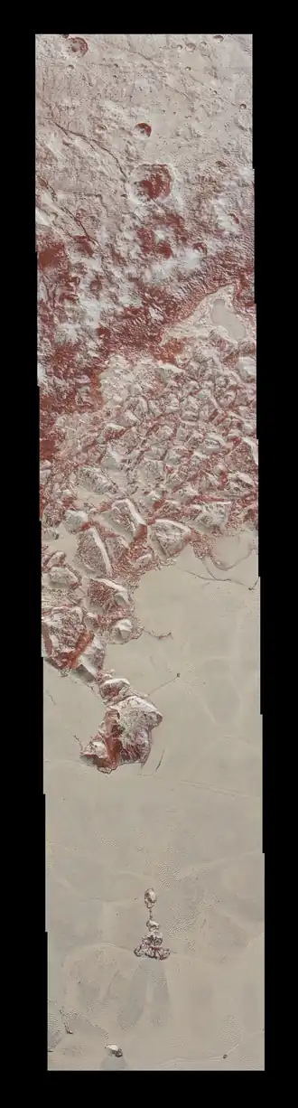 Ces montagnes de glace pouvant atteindre l'altitude de 3 400 mètres sont survolées et photographiées par la sonde New Horizons en juillet 2015.