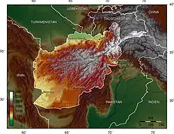 Les plus hauts sommets d'Afghanistan sont le Nowshak (7 492 m) et le Kohe Shakhawr (7 083 m), tous deux situés le long de la ligne Durand qui marque la frontière entre l'Afghanistan et le Pakistan.