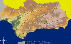 Séparée naturellement de la Meseta castillane par la sierra Morena, elle présente une unité de relief qui la distingue du reste de l'Espagne, caractérisée par trois grands ensembles parallèles : la sierra Morena au nord, la Dépression du Guadalquivir au centre, et les Cordillères bétiques au sud-est. La Dépression du Guadalquivir marque la séparation entre l'Andalousie bétique, et l'Andalousie méditerranéenne.[Passage contradictoire]