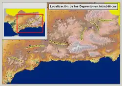 La dépression intrabétique (ou sillon intrabétique (es)) est une série de dépressions qui affectent les systèmes bétiques entre les deux cordillères précédemment évoquées, qu'elle sépare sous la forme d'un couloir. Il s'agit d'un ensemble de petites dépressions discontinues qui s'étendent d'ouest en est parallèlement à la côte : les dépressions de Ronda (rattachée à la cordillère pénibétique), Antequera (reliée à la dépression du Guadalquivir, elle est un ancien golfe de la mer qui occupait autrefois la plaine du grand fleuve), Grenade, ainsi que les fossés ou cuvettes (hoyas) de Guadix, Baza et Huéscar (rattachés à la cordillère Subbétique). La dépression intrabétique est une succession de plaines aux sols marneux et argileux, très fertiles. Au fond de la dépression de Grenade se trouve ainsi la fameuse Vega, exploitée depuis des siècles pour la qualité de ses sols.