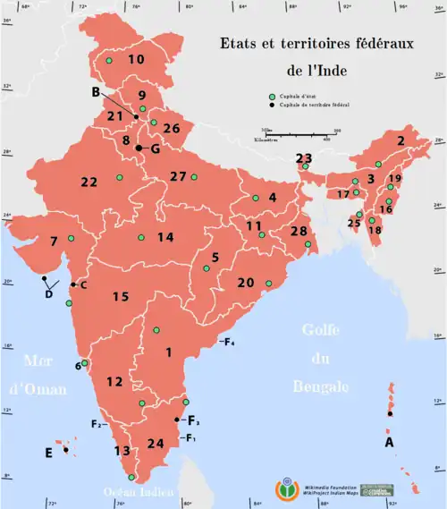 L'Inde est divisée en 28 États (qui sont eux-mêmes subdivisés en districts), six territoires fédéraux et le territoire national de la capitale Delhi. Les États ont leur propre gouvernement élu tandis que les territoires fédéraux sont gouvernés par un administrateur nommé par le gouvernement fédéral.