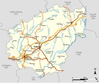 La Corrèze est un département français composé de 280 communes et ayant pour préfecture Tulle. Sa ville la plus peuplée est Brive-la-Gaillarde. Elle est entourée de six départements : la Haute-Vienne au nord-ouest, la Creuse au nord, le Puy-de-Dôme au nord-est, le Cantal à l'est, le Lot au sud et la Dordogne au sud-ouest. Le département ne dispose pas d'accès à la mer ; il a une superficie de 5 857 km2.