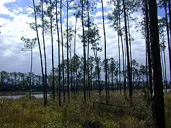 On dénombre trois espèces dominantes de pins en Floride : pinus palustris, pinus elliottii et pinus serotina (pond pine)[38],[39]. Les sous-bois sont formés d'arbustes à baies et de petits chênes[38]. Les pinèdes poussent généralement sur des sols sableux et acides[40] ; la faune est diverse : petits rongeurs (sigmodon, blarina), cerf de Virginie[40], gophère polyphème, geai à gorge blanche, etc.