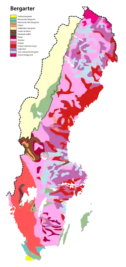 La Suède peut être divisée en trois grandes régions en termes de couverture rocheuse (Roche-mère) : le bouclier baltique, les calédonides et les terrains sédimentaires en dehors des calédonides[B 1].