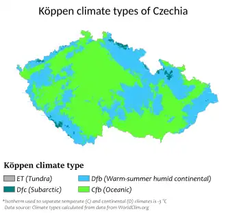 La Tchéquie se trouve dans la zone tempérée de l'hémisphère nord, et jouit pour cette raison d’un climat continental tempéré : la température moyenne annuelle est de 7,9 °C (février: 0,5 °C, juin: 18,6 °C).