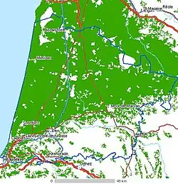 C'est cette partie, la plus vaste du département, qui lui a donné son nom. Elle correspondait à l'époque à un paysage de lande, avant la plantation des pins consécutive à la loi du 19 juin 1857. Elles se composent :