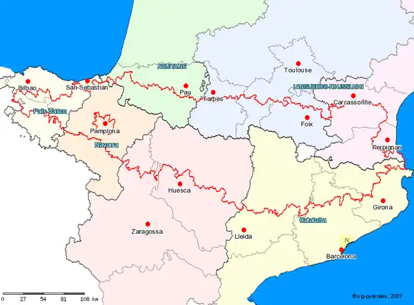 - ↑ Pyrénées-Atlantiques est aussi le nom d'un département français autrefois appelé Basses-Pyrénées