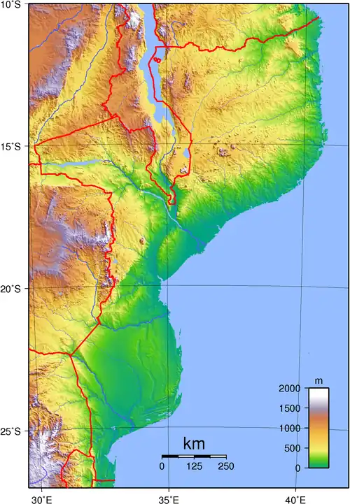 La principale chaîne de montagnes se trouve au nord du Zambèze, à l'est du Lac Chilwa : c'est le massif du Namuli, dont le point culminant, le pic Namuli, s'élève à 2 700 m ; les pics secondaires : le Molisani, le Mruli et le Mresi atteignent des altitudes comprises entre 2 000 et 2 400 m. Ces montagnes sont couvertes de forêts luxuriantes. Plus au nord, les vallées sont séparées par des chaînes de plus de 900 m d'altitude. Le littoral sud-est du Lac Malawi est bordé par une crête abrupte (1500 à 1 800 m d'altitude, soit une dénivellation de 915 m sur 10 km). La région comprise entre le Malawi et Ibo offre un panorama remarquable avec ses pics granitiques se dressant depuis le plateau.