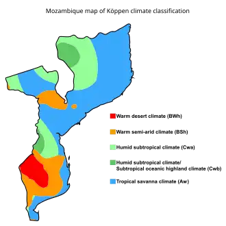 Le Mozambique possède un climat tropical à deux saisons : une saison humide d'octobre à Mars, et une saison sèche entre avril et septembre. Les conditions climatiques dépendent surtout de l'altitude : les pluies, abondantes le long des côtes, se raréfient au nord et au sud.