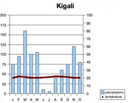 Le climat rwandais est de type équatorial tempéré par l'altitude, avec deux saisons des pluies (de février à avril, puis de novembre à janvier). Les régions les plus hautes de l'ouest sont les plus fraîches, avec une moyenne annuelle inférieure à 15 °C. Il arrive de rencontrer du gel et de la neige en montagne. Le climat devient plus chaud au fur et à mesure que l'on progresse vers l'est ; les grandes chaleurs sont cependant rares.