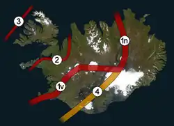À l'époque tertiaire, l'emplacement de l'Islande est occupé par un complexe de rifts, dont ceux situés les plus à l'ouest avortent successivement vers 7 millions d'années[4] après avoir donné les formations des fjords du nord-ouest et du Snaefellsnes[2]. Ces coulées de basalte qui couvrent le quart nord-ouest de l'île atteignent une épaisseur de 3000 m[5].