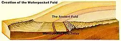 Il y a entre 70 et 50 millions d’années, l’orogenèse laramienne modifie le relief de la région en donnant naissance plus à l’est aux montagnes Rocheuses. Les forces immenses de l’orogénèse modifient l’aspect du sol. Les formations géologiques précédemment superposées à plat se soulèvent par endroits. Les strates à la base horizontales se courbent et donnent naissance à des plis. Le Waterpocket Fold, l’attrait géologique principal du parc national, est un de ces plis. Il s’étend sur 160 kilomètres du nord au sud. Les roches de la partie occidentale du pli ont été surélevées de près de 2 100 mètres par rapport aux zones orientales[21]. Cela signifie que les roches les plus vieilles sont exposées du côté ouest et les plus récentes du côté est. Ce pli pourrait avoir été créé par une faille appartenant au socle rocheux datant du Précambrien[22].