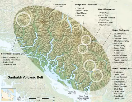 La zone volcanique du mont Garibaldi au sud-ouest de la Colombie-Britannique est l'extension nord de l'arc volcanique des Cascades. Cette région accueille les plus jeunes volcans explosifs du Canada. Elle tire également son origine de la subduction des Cascades. Le volcan le plus au nord, le mont Meager, a connu une importante éruption il y a environ 2 350 ans. Cette éruption était probablement comparable à l’éruption du mont Saint Helens de 1980. Les cendres furent projetées jusqu’à l’ouest de la province canadienne de l’Alberta. Volcan très instable, il connut au moins trois glissements de terrain importants en 7 300 ans. Des sources chaudes à proximité du mont Meager et du proche mont Cayley indiquent que la chaleur du magma est toujours présente sous le volcan.