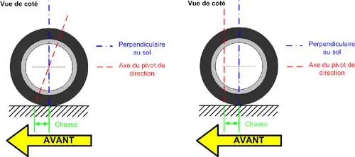 - on peut donner un angle au pivot de direction de la roue (angle de chasse). On retrouve cette méthode dans la plupart des véhicules routiers : automobiles, motocyclettes, vélos, poids lourds ;